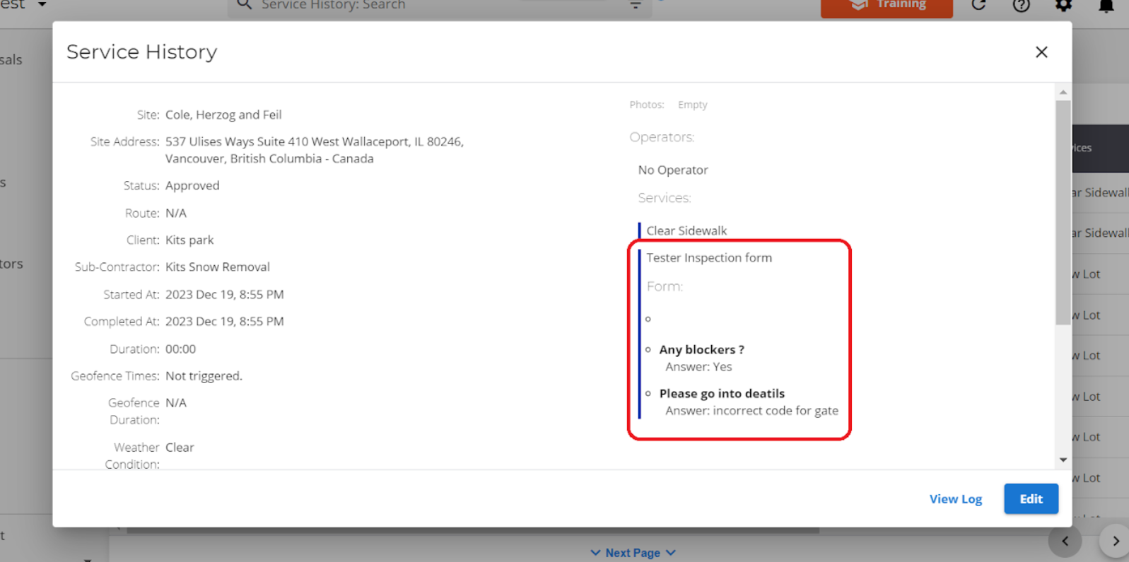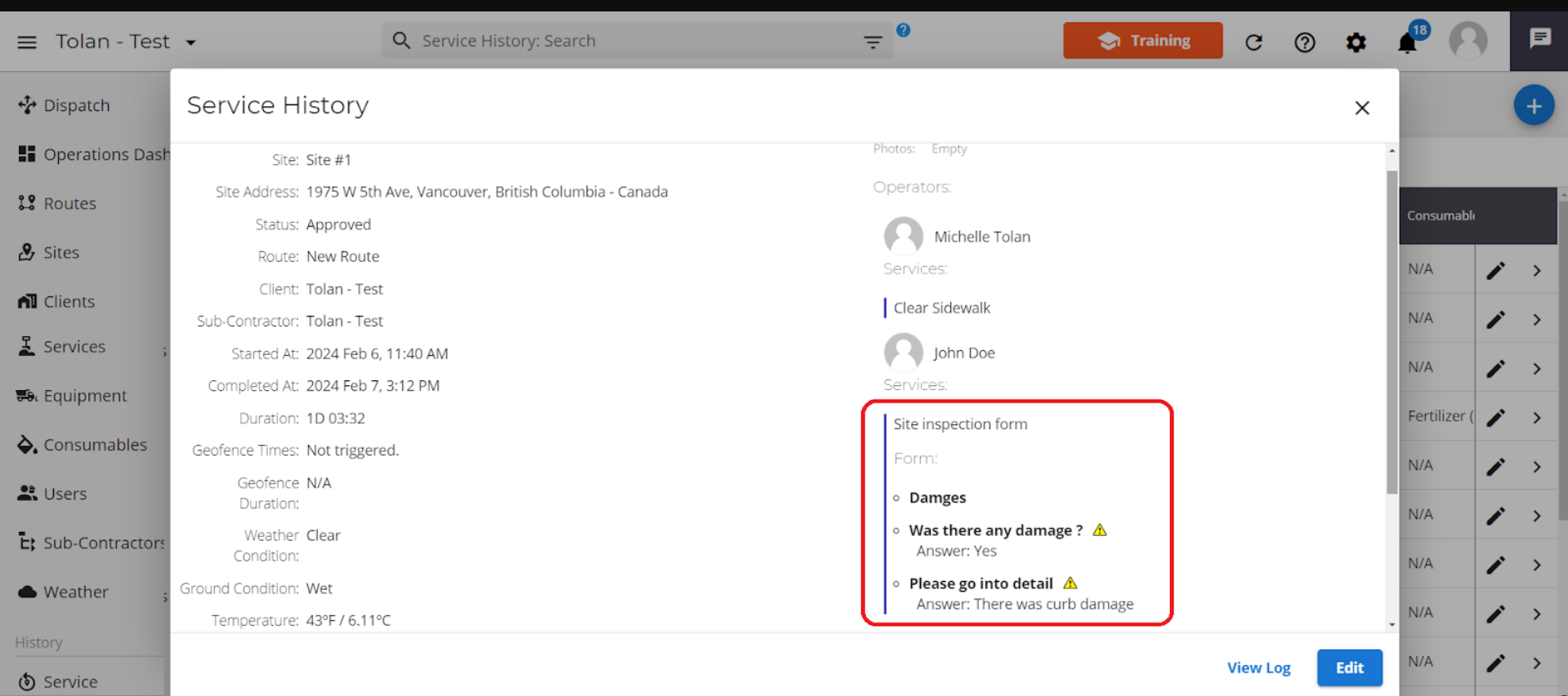 The first way is through the service history page. Every record here represents one site serviced. Select a record to open it up. The answer to the form will be on the bottom left-hand side of a record.