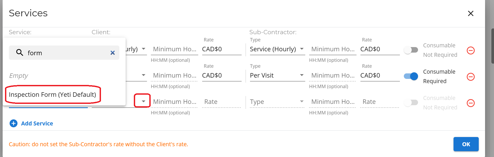 Once you have found it, set the charge type to either Per Visit or Monthly and enter in a figure. If you want this to be a free service enter in $0. Click the OK button at the end of the screen to update your service list.