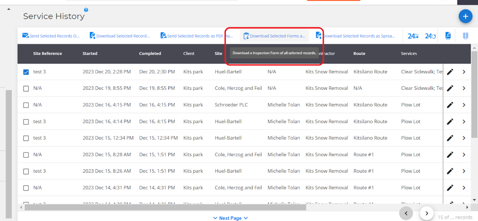 On the Service History Page, select a record and hit the download inspection form button. The Form will be downloaded in PDF format.