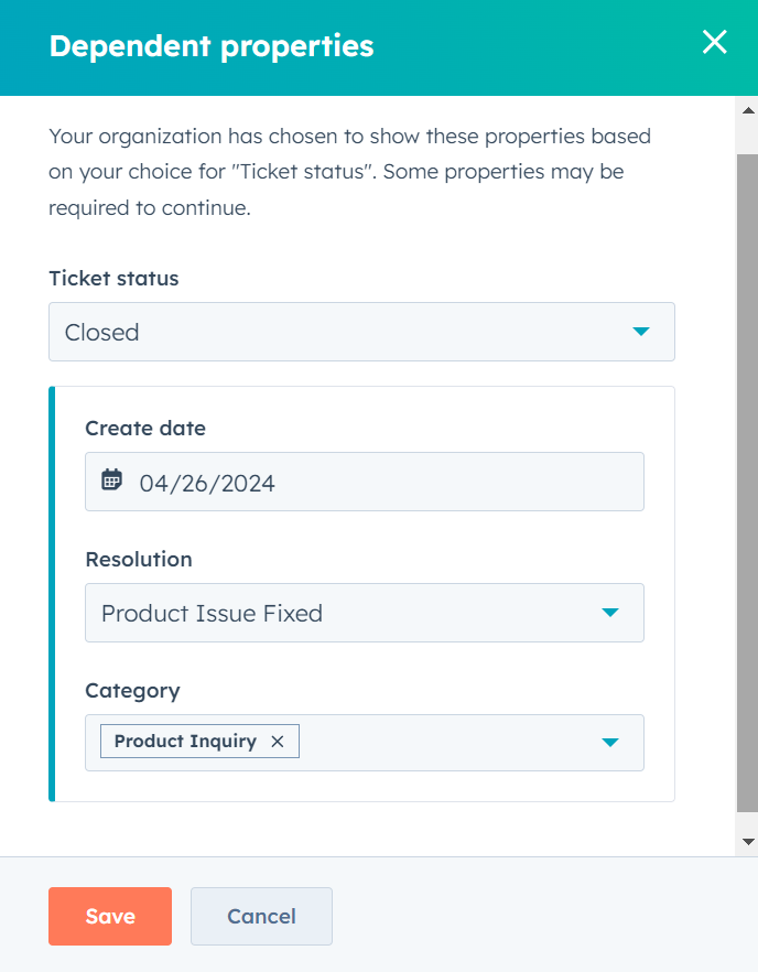 A ticket is broken down into several fields of information. These are known as properties. Properties can let us know things like when the customer first contacts us, the employee who is handling the ticket, the type of issue it is, and more. You can also create custom ticket properties to capture the information most relevant to your business needs.
