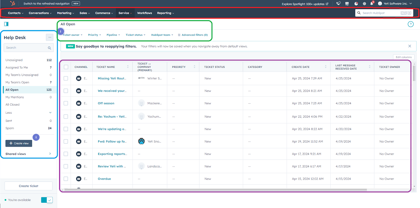 The Help Desk is Hubspot‘s ticket management system. When an email comes into the support inbox, a ticket is created at the help desk. The landing page is where you can get a bird's eye view of all of your tickets, along with their priorities.