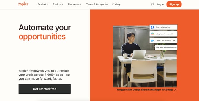 Zapier provides workflows to automate the use of web applications together. It is often described as a translator between web APIs, helping to increase worker productivity by saving time through automation of recurring tasks, and business processes such as lead management.