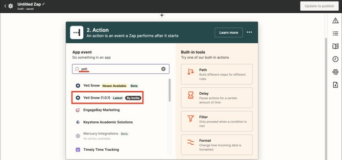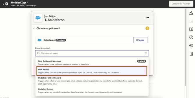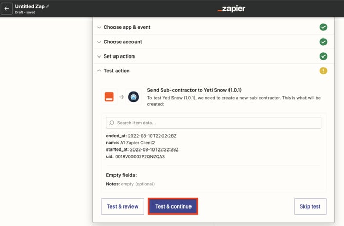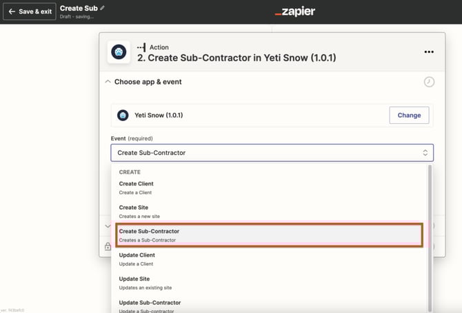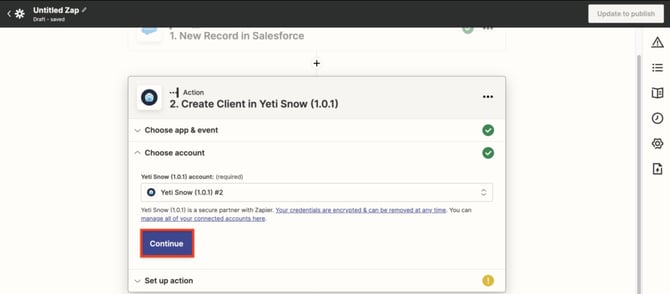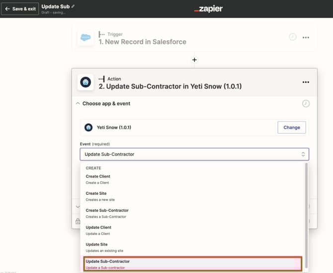 The next step is to "Create Zap" which updates your client information on Yeti when you edit your Subcontractor on Salesforce. Following the same steps as above, select "Update Record" as shown in step 4.