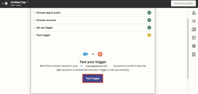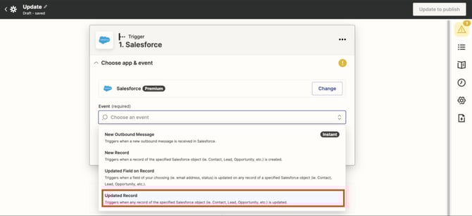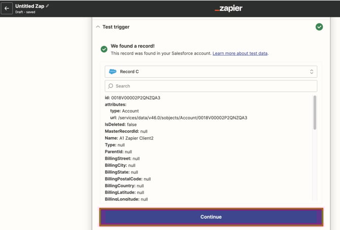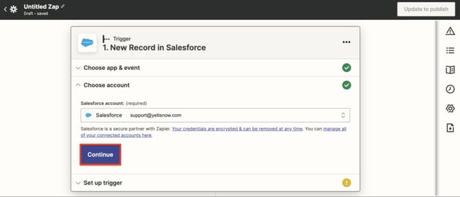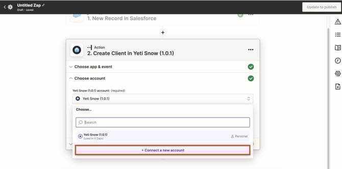 When you create another "zap" to update your client information on Yeti when you edit "Accounts" on Salesforce, you need to select "Updated Record".