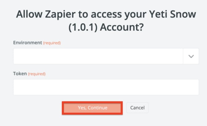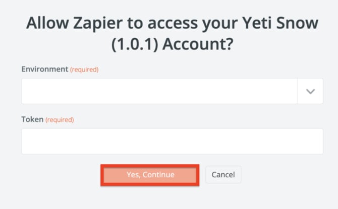 20. A pop-up window will appear. Select the environment where you want the integration to be made, and insert the Yeti token. The following steps demonstrate where the Yeti token can be found.