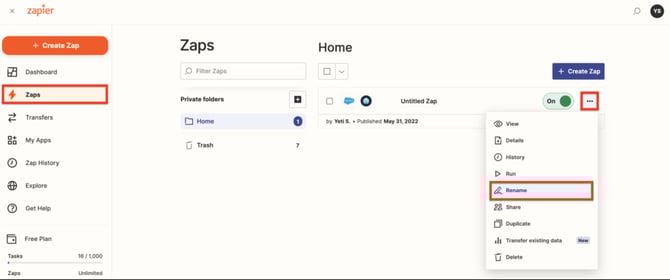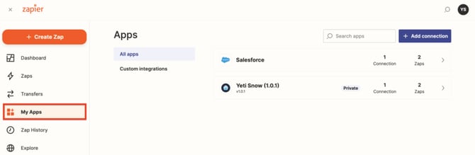 35. Now you can see the Zapier apps that you created to connect Salesforce with Yeti.