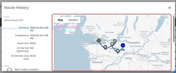 The Route History Map allows you to review completed routes and analyze crew performance.
